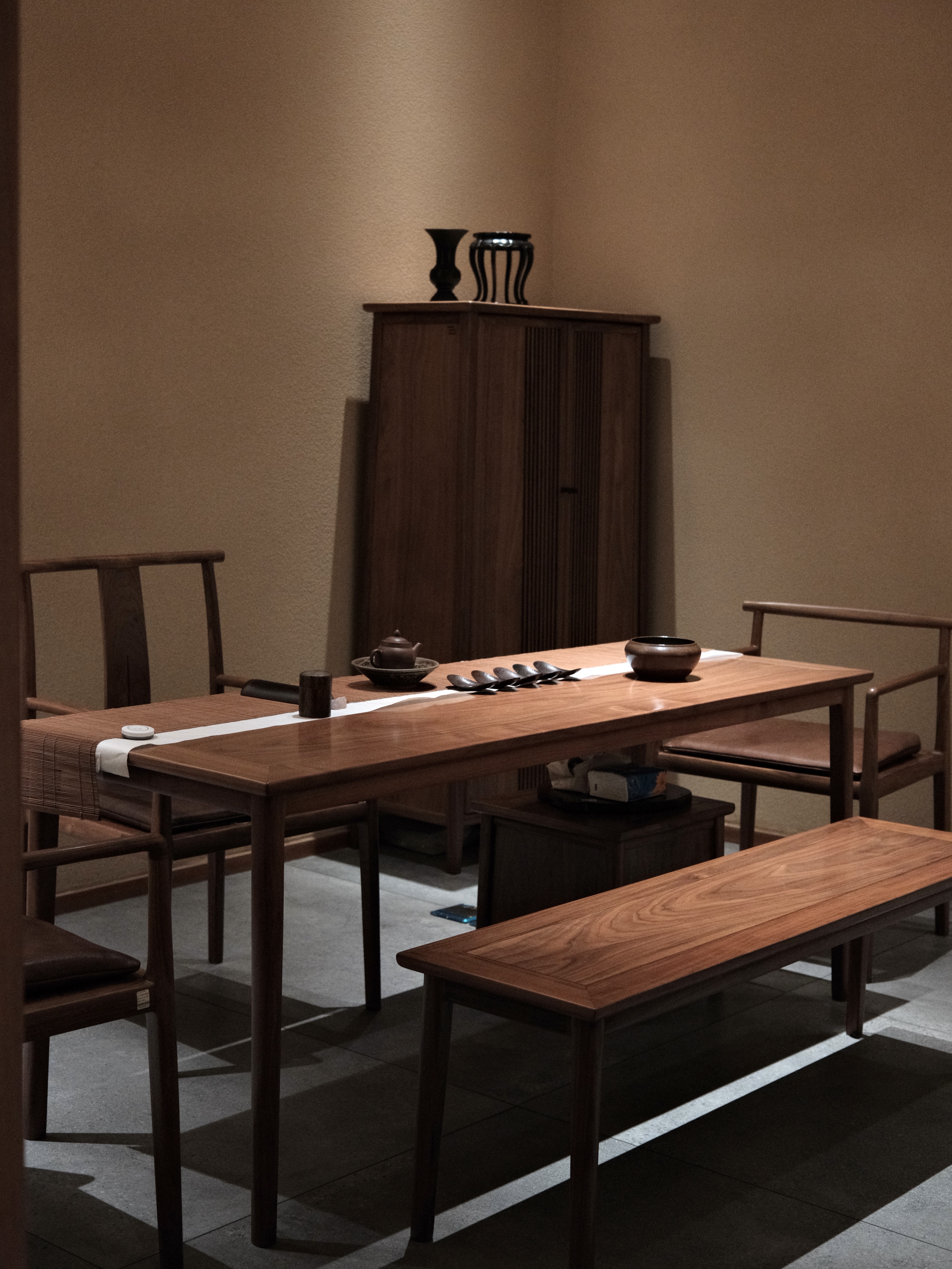 朗元家具的选材上坚持使用实木。实木温润厚实的质感是其他材料所无法替代的。实木是一种会呼吸的材料,随着气候的变化会收缩膨胀,所以朗元所有的家具和传统家具一样采用了四边框加芯板穿带的结构,来使桌面稳固,这种结构比现在主流的整板实木桌面要费工许多,却也安心许多。
